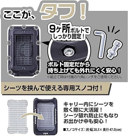 角ばった形状と、9箇所ボルト固定によるタフさが大きな特徴です。持ち上げた際のたゆみが少なく安定して運べます。専用スノコが付属しており、シーツをはさむことができるのでお出かけ中も安心です。正面ドアは左右開き可能で、付け外しも本体が組まれた状態で簡単に行えるので、ハウスとしての使用もしやすい作りになっています。