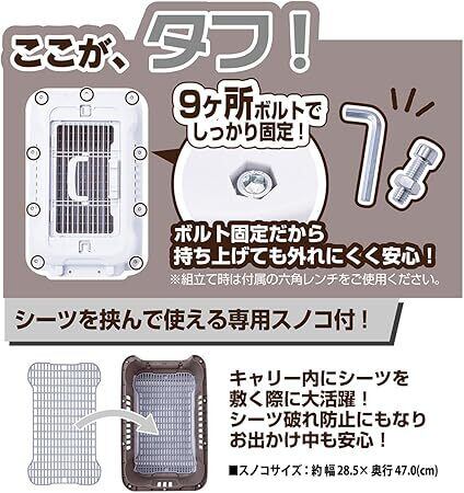 角ばった形状と、9箇所ボルト固定によるタフさが大きな特徴です。持ち上げた際のたゆみが少なく安定して運べます。専用スノコが付属しており、シーツをはさむことができるのでお出かけ中も安心です。正面ドアは左右開き可能で、付け外しも本体が組まれた状態で簡単に行えるので、ハウスとしての使用もしやすい作りになっています。